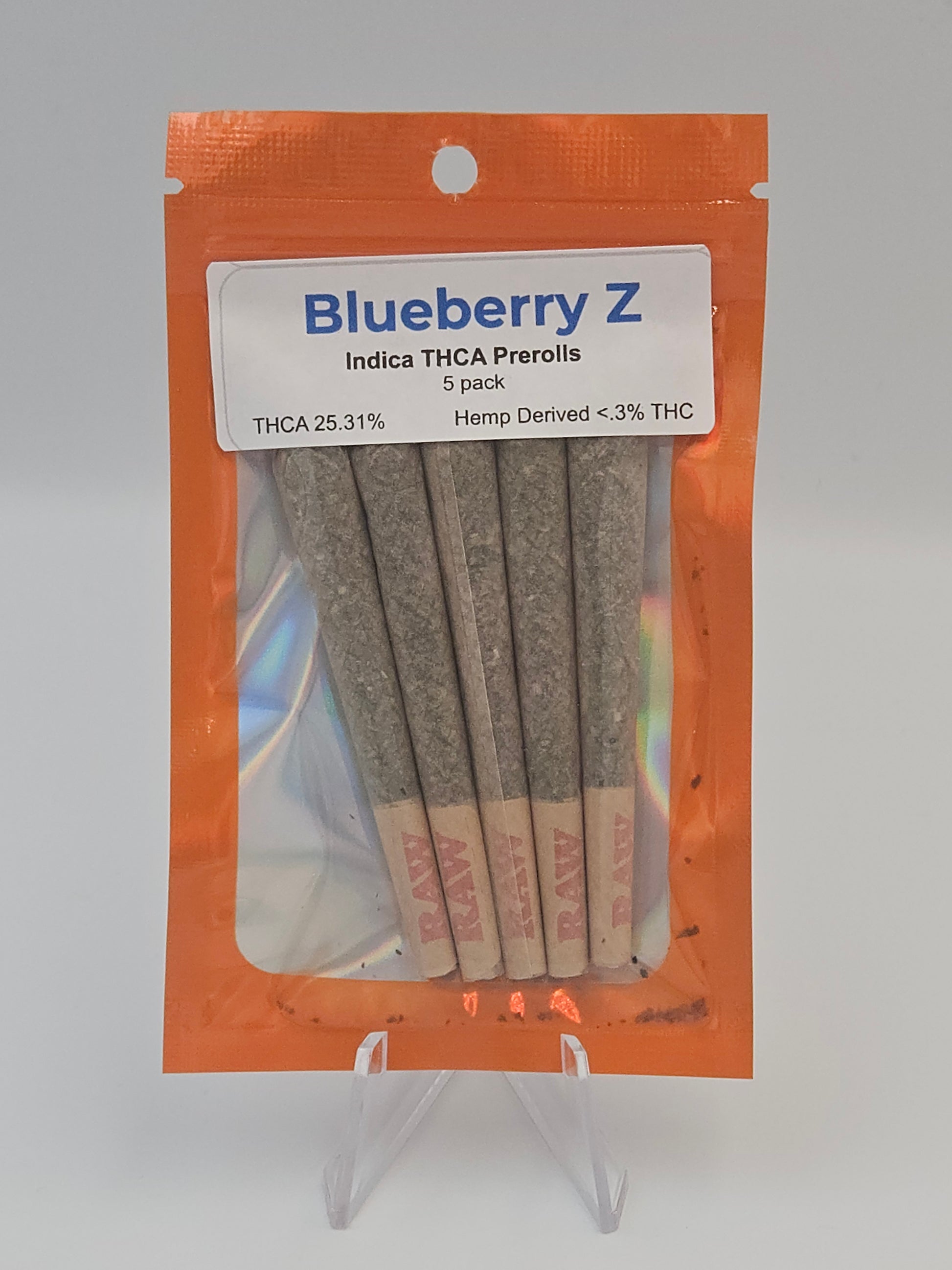 Our Blueberry Z THCA prerolls are packed with sweet, fruity flavor and the potent relaxation you expect from a top-shelf Indica. Made from Blueberry Z shake β€” a blend of Blueberry x Northern Lights #5 x Skunk Kush x Durban β€” these prerolls deliver a candy-like blueberry zkittles taste with a smooth, trichome-rich smoke.